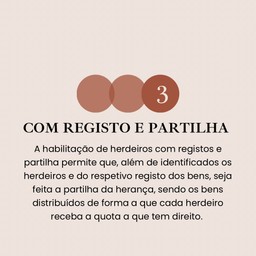 - COM REGISTO E PARTILHA: A habilitação de herdeiros com registo e partilha permite que, além de identificados os herdeiros e do respetivo registo dos bens, seja feita a partilha da herança, sendo os bens distribuídos de forma a que cada herdeiro receba a quota a que tem direito.
